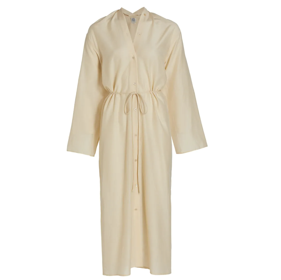 This romantic silk and cotton combine shirtdress is a stupendous and versatile piece to pair with a tan wool coat and tall boots for fall.