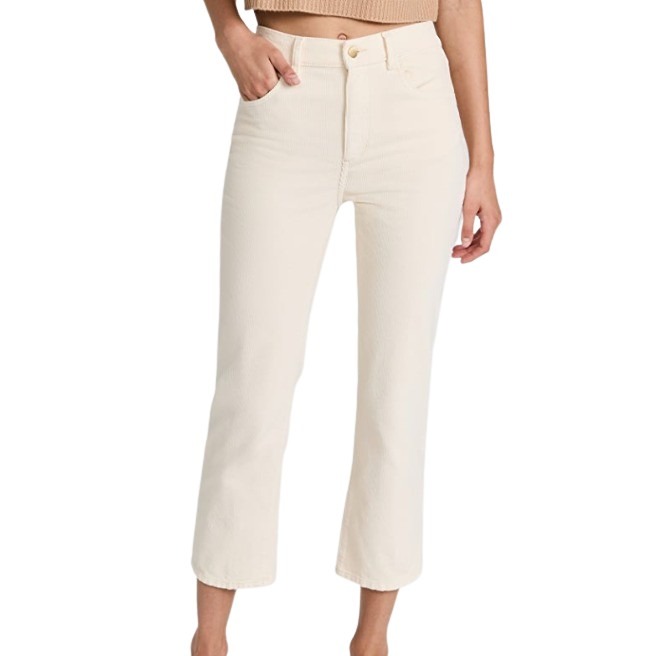 Conventional cords get an exchange with a recent cut back and cream shade, good for pairing with a vest or sweater and booties this season.