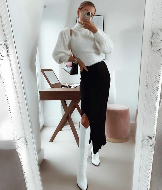 En fundamental, estos diseños de faldas de tela camiseta son una de las prendas más versátiles a las que podremos recurrir para vestir. Con estas, podemos crear muchas combinaciones, sobre todo si las usamos en colores neutrales. Por ejemplo, en este primer look vemos una falda negra básica, combinada con un suéter tejido blanco y botas blancas. El corte de la falda es midi, con una abertura en la pierna ¡Te verás muy sensual!