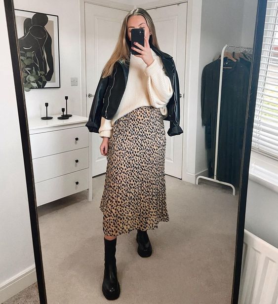 Mira esta otra opción que como podrás ver es great perfecta para darle un toque fashionable, jovial a tu imagen. En este look vemos especificamente una falda con animal print de leopardo, combinada con un suéter tejido en shade beige. Te recomiendo que la complementes siempre con una prenda complementaria, que en este caso es una chamarra de cuero.