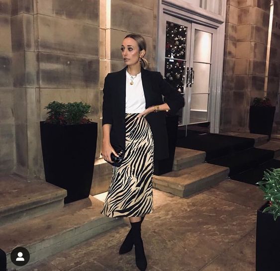 Analicemos este primer ejemplo de look usando faldas midi animal print, en este tenemos una falda con print de cebra, en shade beige con negro. Se complementa con camiseta básica de shade blanco y encima añadimos un blazer negro. Dale el toque final con botines negros de pana o de charol.