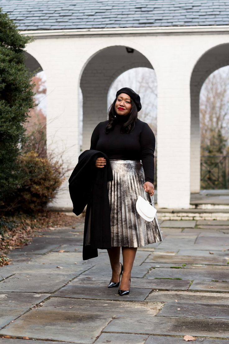 En este de abajo por ejemplo vemos una falda midi plisada de shade plata. Combinada con un suéter básico de shade negro y una boina. Dale un toque más elegante a este look con unas zapatillas cerradas de shade negro y terminación en punta.