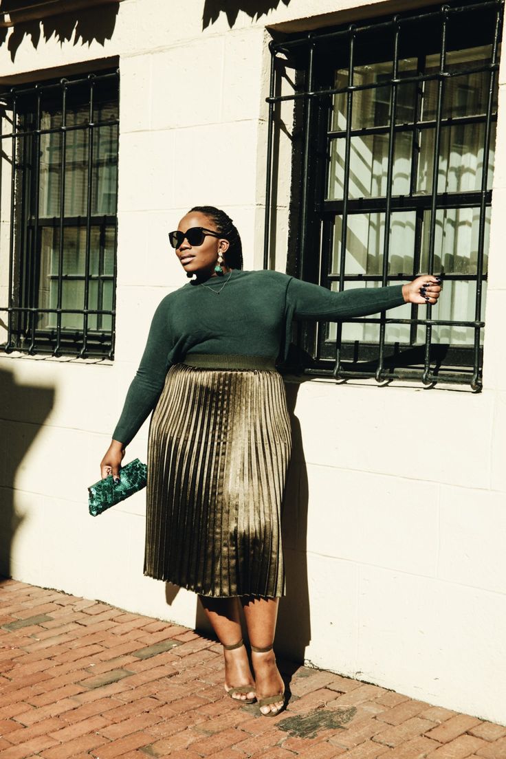 Por ejemplo, en este primer ejemplo de los seems con faldas midi para gorditas, vemos un modelo muy especial. Se trata de una falda midi plisada, con tela metálica, sobre todo de shade dorado se ve muy elegante y podrás combinarla con un suĂ©ter básico en un shade que haga armonĂa con la falda, en este caso vemos un suĂ©ter verde, con zapatillas doradas. ¡Se ve increĂble!