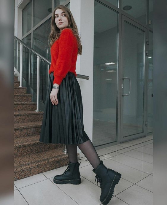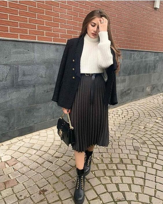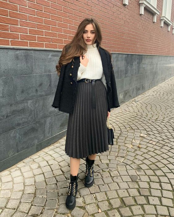 Outfits con faldas midi para invierno: Appears to be con faldas plisadas para invierno