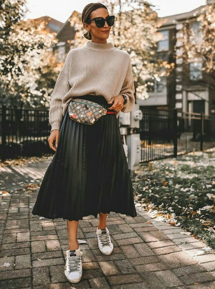 Muy associated al look anterior tenemos esta propuesta, usando una falda plisada negra, con suéter beige, riñonera y lentes de sol. Es mucho más casual, pero igual se ve con mucho estilo.