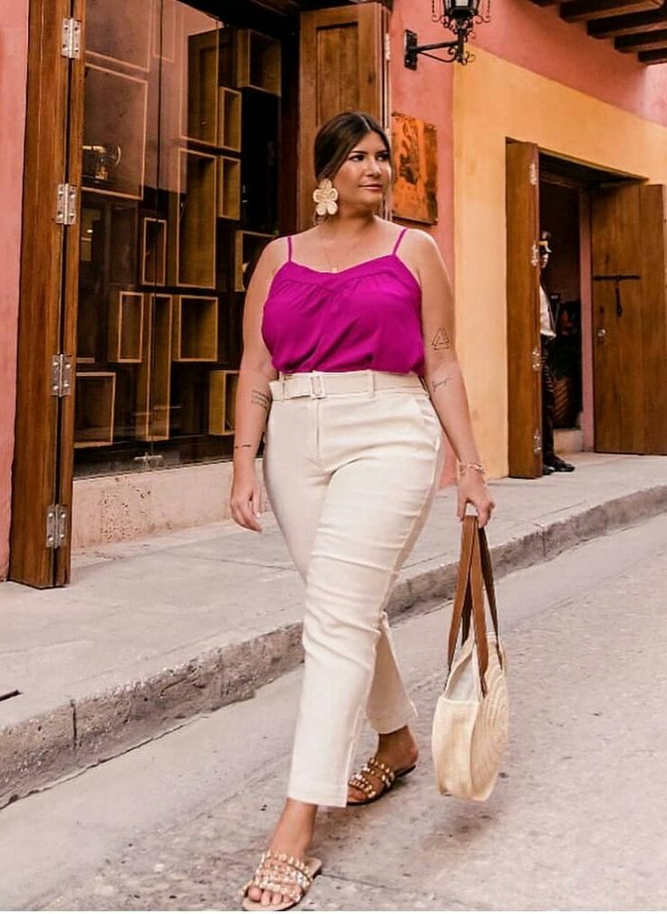Asà como también podremos toparnos con ideas con blusas coloration rosa para diferentes temporadas del año, ya sea para verano o bien para otoño – invierno. Algunas de las mejores blusas que podrás usar, son las de diseños de tirantes, como vemos en el siguiente ejemplo usando un pantalón estilo trousser coloration caqui de tiro alto con un excessive de tirantes coloration rosa fucsia se ve divino.