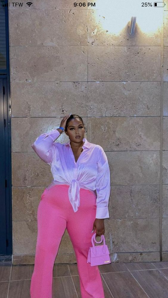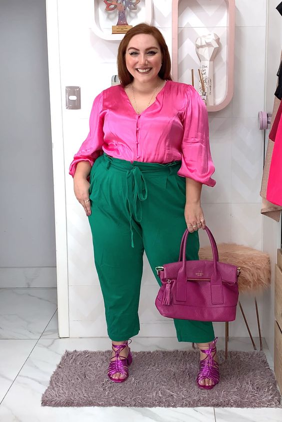 Mira también cuales son esas prendas que podrás combinar para conseguir alguno de estos atuendos semi formales con rosa para gorditas. En este look por ejemplo vemos un pantalón de coloration verde estilo trousser con camisa de botones rosa manga larga, complementa con sandalias de tacón en coloration rosa también. ¿Qué te parece la combinación!