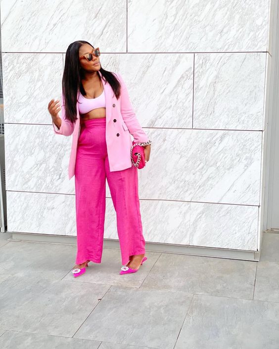 Y la otra opción es este look en donde vemos un pantalón rosa tipo palazo de pierna ancha y recta, de tiro alto combinado con una camisa blanca de botones. De preferencia amárrala a la cintura ¡Se te verá increÃble!