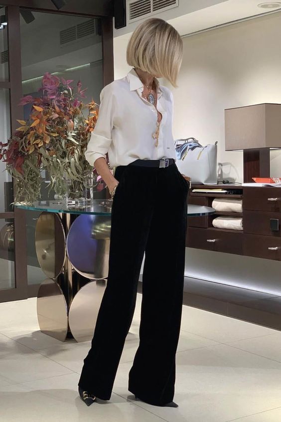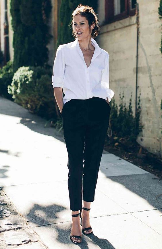 Outfits con camisa blanca y pantalón negro para mujeres maduras