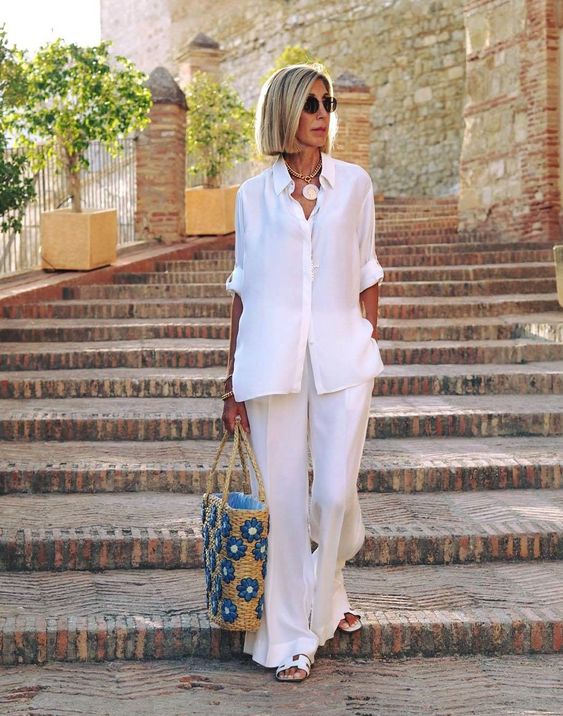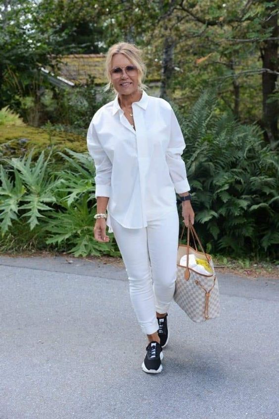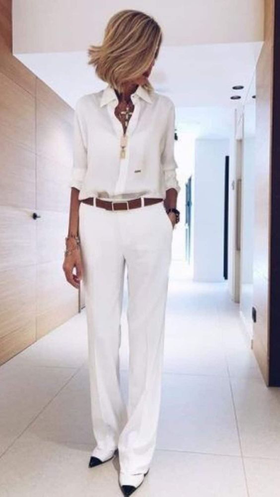 Combina camisas blancas con pantalón blanco son otras de las mejores ideas para combinar una camisa blanca si eres una mujer madura que podrás intentar. Algo que me encanta de este tipo de combinaciones que como podrás ver en los diferentes ejemplos que encontramos para ti, puedes usar prácticamente todo tipo de modelos de pantalones desde los más casuales a los diseños más especiales.