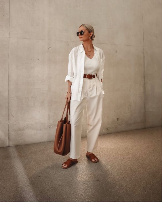 Otra combinación que podrás intentar es la siguiente, que se ve mucho más relajada y jovial este lo consigues usando un pantalón blanco fluido, con un excessive básico coloration blanco también, faja el excessive y encima usa una camisa blanca de botones. Déjala abierta para darle un toque mucho más moderno.