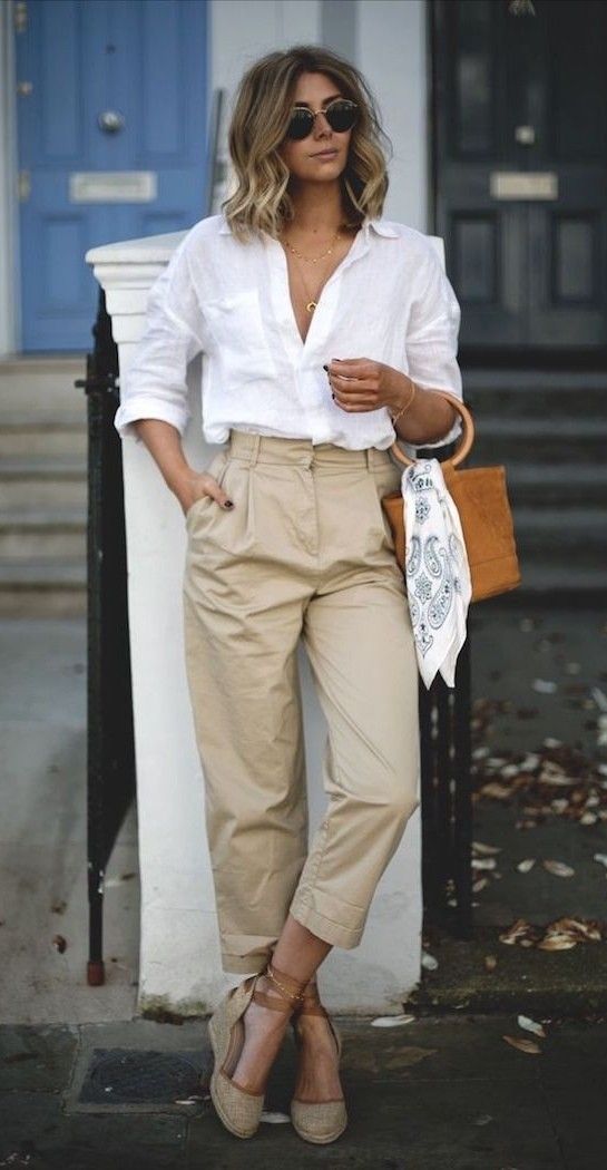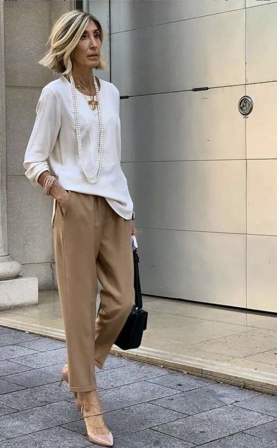 Ideas para combinar una camisa blanca si eres una mujer madura: Ideas de camisa blanca con pantalón caqui