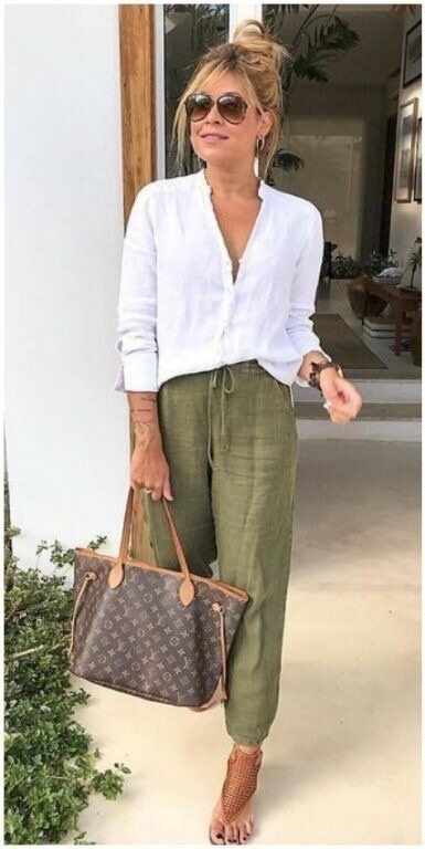 Veamos por ejemplo como darle un montón de personalidad a nuestra imagen, usando un pantalón de coloration verde militar de tela muy fluida y con movimiento, faja la camisa y complementa el atuendo con sandalias de piso en coloration dorado. El elemento remaining puede ser un bolso grande y lentes de sol y estarás lista para el dÃa a dÃa.