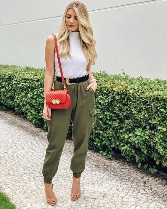 Analicemos este look por ejemplo que me encantó la combinación, se trata de un pantalón verde militar con un prime básico de shade blanco. Este lo puedes elevar al máximo con un cinturón de shade negro para estilizar más tu cuerpo. Además le vas a dar un toque de shade con un bolso rojo y calzado rojo también.