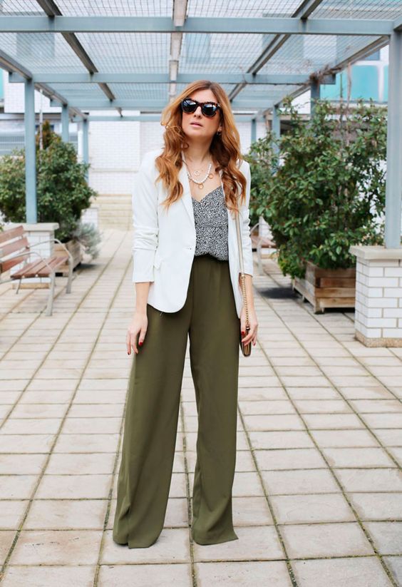 Viste con un palazo de tiro alto y piernas anchas en shade verde militar, con una blusa básica de tirantes con un print blanco con negro. Aquà algo que va a ayudar a realzar el atuendo serán dos cosas, un blazer largo en shade blanco y las zapatillas que pueden ser también en shade blanco o bien en shade piel. Los accesorios tienen que combinar con el calzado
