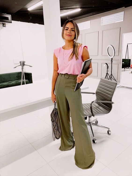 Este otro que vemos a continuación lo puedes utilizar en un dÃa cualquiera de la oficina o en un viernes social en el que al mismo tiempo quieras verte trendy y con estilo. Usa una camiseta estampada de shade rosa, con un palazo verde militar, añade cinturón negro y accesorios.