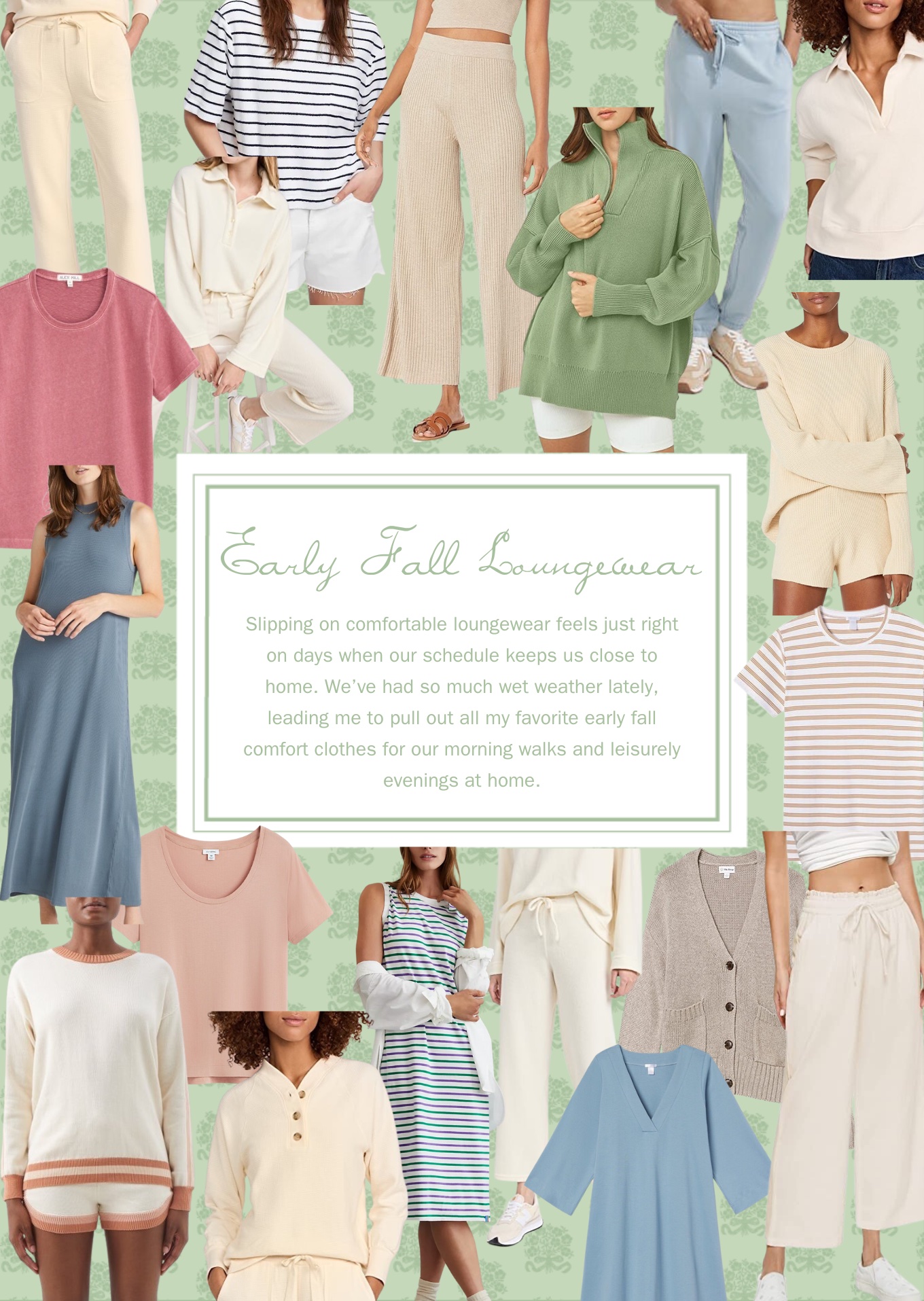 Slipping on comfortable loungewear feels glorious on days when our schedule retains us close to home. We’ve had lots moist local weather today, major me to tug out all my favorite early fall comfort clothes for our morning walks and leisurely evenings. I simply currently found this v-neck waffle knit prime and cropped pull-on pants that I can’t get adequate of. They’re so plush and cozy, I actually really feel like I’m sporting pajamas all day. Loungewear like this, with a unfastened match and elastic waist, combine extra comfort with casual mannequin. See beneath for further early autumn loungewear to love.