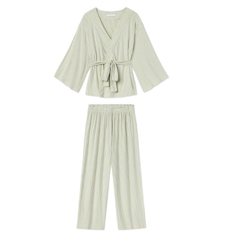 Cozy up on this cozy striped lounge set that features a kimono-style robe prime and enormous leg pants for optimum comfort.