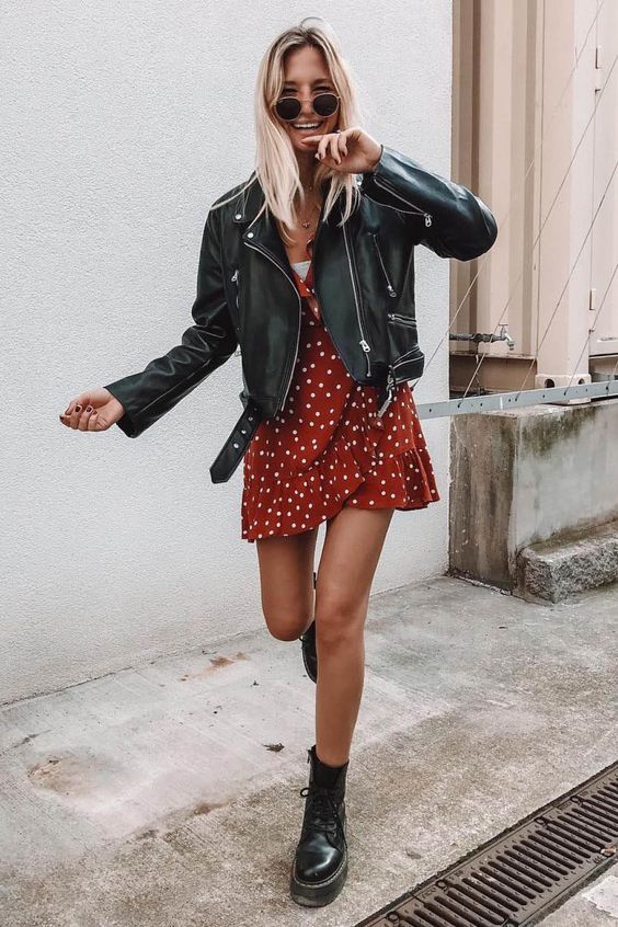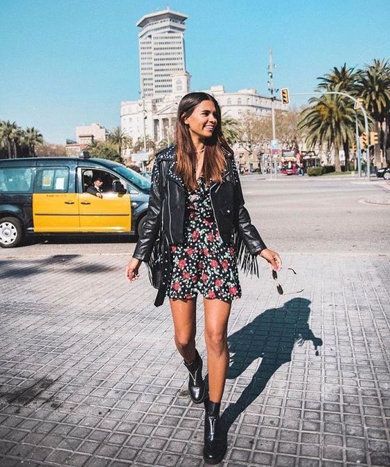 Mira por ejemplo este tipo de vestido que es un modelo básico en shade negro, corto de manga corta y cuello redondo. Otro look que podrás imitar es el siguiente en donde vemos un vestido corto con vuelos en la falda y botas militares con chamarra de cuero para complementar.