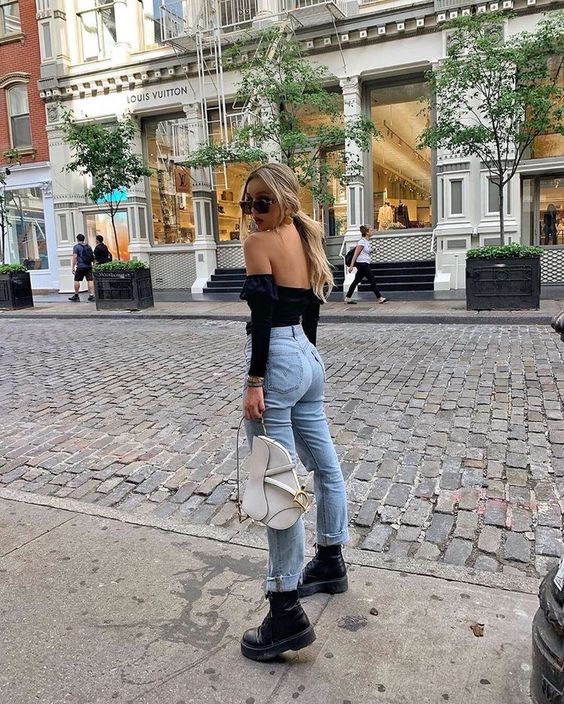 Empezando por el punto de que literalmente podrás usar cualquier modelo de pantalón de mezclilla para combinarlo con tus botas militares. Aquà algunos de los mejores ejemplos, por ejemplo jeans de shade negro, pantalones de mezclilla básicos en shade azul, diferentes estilos, skinny, mom jeans, and so forth. En este look por ejemplo vemos un modelo de piernas rectas, con botas militares shade negro y blusa off the shoulders en shade negro también.