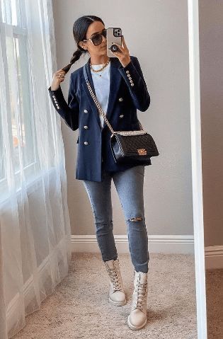 Podrás intentar el siguiente look en el que vemos, un pantalón básico de mezclilla skinny, combinado con una blusa básica estilo camiseta de shade blanco. Encima de esto puedes complementar con un blazer largo ya sea en shade negro o azul marino. Eleva el atuendo con accesorios, como lentes de sol, un bolso de cadena estilo bandolero con unas botas militares en shade claro, blancas o de shade camel ¡Te verás increÃble!