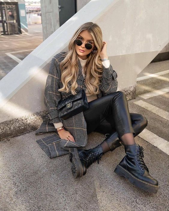 Por ejemplo, te invito a que consideres el siguiente look en donde vemos como protagonista del look a un pantalón de cuero básico, con una blusa básica de manga larga y cuello alto en shade negro. Encima de este atuendo complementa con un abrigo largo en shade camel o café claro y el toque closing claro que se lo van a imprimir las botas militares. ¡No te olvides de los accesorios! Bolso, lentes de sol, and so forth.
