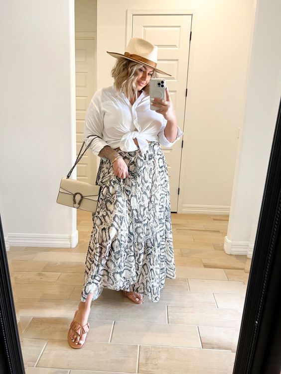 Entre muchos modelos más, que podrán formar parte clave de tus atuendos del diario. Analicemos por ejemplo este look que es uno de mis favoritos. En este vemos una falda maxi estampada con print de serpiente en shade blanco con negro. Se combina con una camisa de botones blanca amarrada a la cintura. El toque remaining lo aporta el sombrero de palma y ala ancha perfecto para el sol, en cuanto a calzado vemos sandalias de piso.