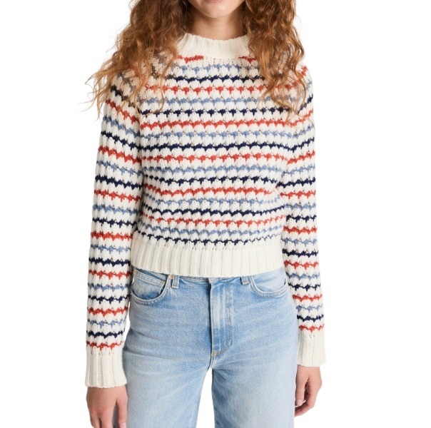 This clean raglan sweater choices festive crimson, white and blue stripes. Pair it with denim for a relaxed weekend mannequin.