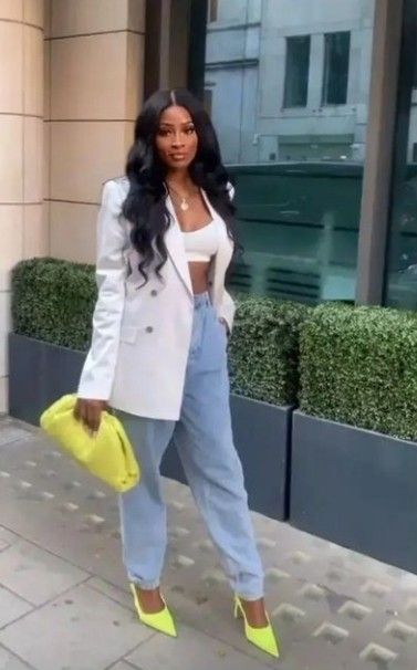 Aquà los seems con jeans de piernas anchas a intentar, son los siguientes usa crop tops en colores neutrales como blanco, negro o del color del blazer. Encima usa un blazer en color naranja, verde brillante o rosa que son los colores del momento. Eso si, complementa con zapatillas o tenis blancos básicos.