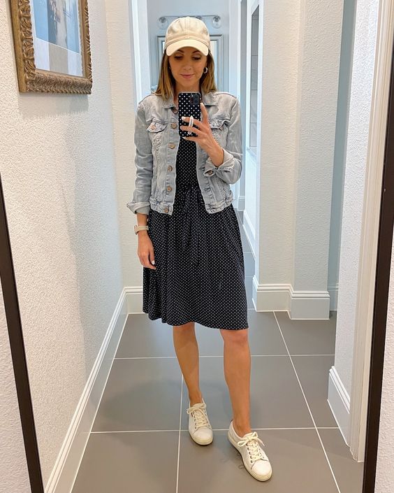 Te puedes inspirar en el siguiente look en donde vamos a ver un vestido básico casual con estampado a rayas, la base del vestido puede ser en color blanco con rayas grises o café claro. Te recomiendo que complementes el look con tenis estilo vans. El toque especial al look se lo da el cinturón de la misma tela del vestido.