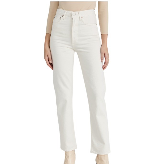 I like carrying white denim even into fall and winter, and this pair of 90’s type pinch waist denims could be good with suede booties and belt, plus a shirt or sweater.