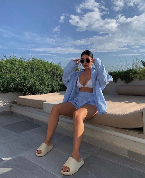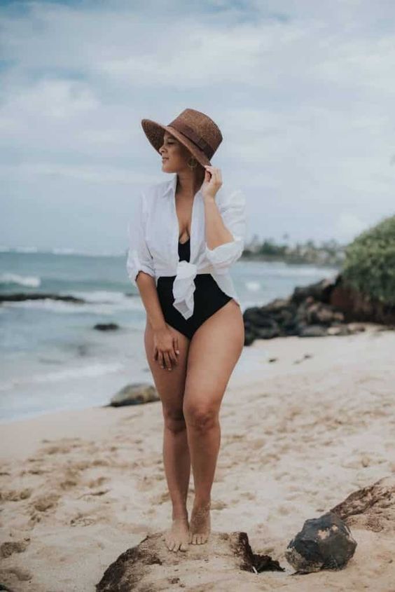 Logra un look mucho más fashionable y exact, usando un traje de baño completo en el color de tu elección, pero en este caso vemos un traje color negro. Con una camisa de botones blanca oversize, amarrada a la cintura encima de tu traje de baño ¡Me encanta esta combinación!