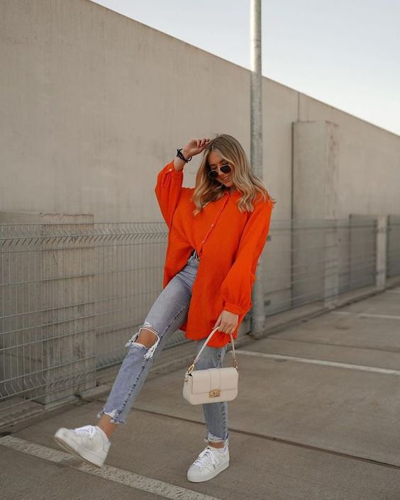 A continuación tenemos otro ejemplo que es mucho más casual y relajado que el primero, en este vemos un conjunto de temporary con camisa, ambos en coloration naranja y se combina con excessive básico de coloration blanco. Añade accesorios que le vayan a dar un plus al look como lentes de sol, bolso, and so forth. ¡Se ve muy fashionable!