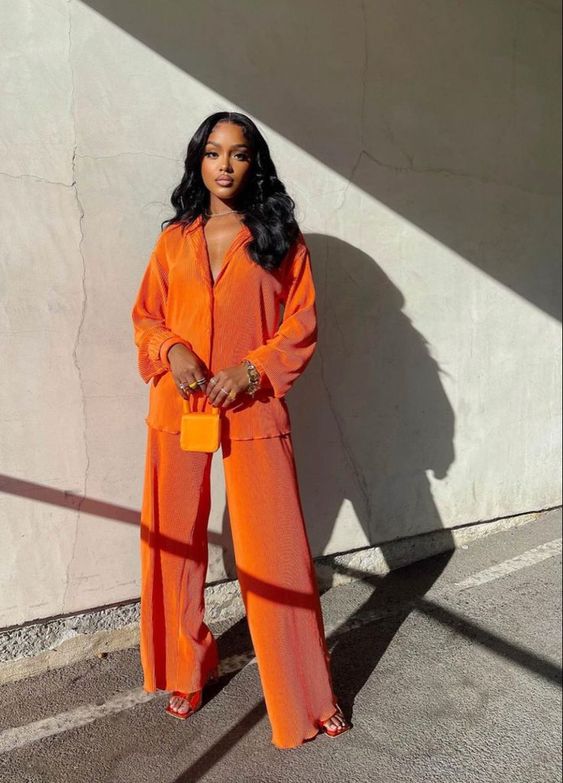 Por eso a continuación vamos a ver un par de ellos, por ejemplo en este primer look tenemos un imponente conjunto coloration naranja de pantalón con blusa, este además se complementa con accesorios del mismo tono, con la finalidad de crear un look monocromático. También tenemos la siguiente alternativa…