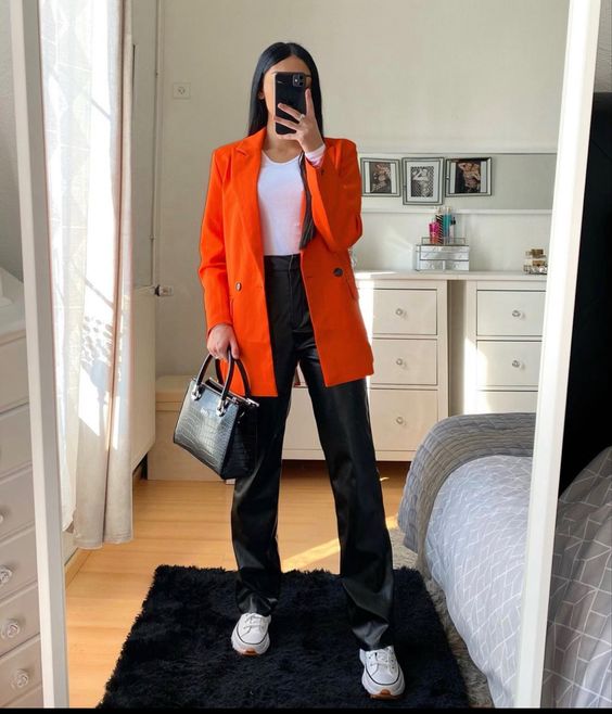 Otro de los seems con blazer coloration naranja que podrás considerar, es este en donde vemos como base del look un pantalón de cuero coloration negro, combinado con un excessive básico de coloration blanco, encima complementamos con un blazer naranja eléctrico y finaliza el look con tenis.