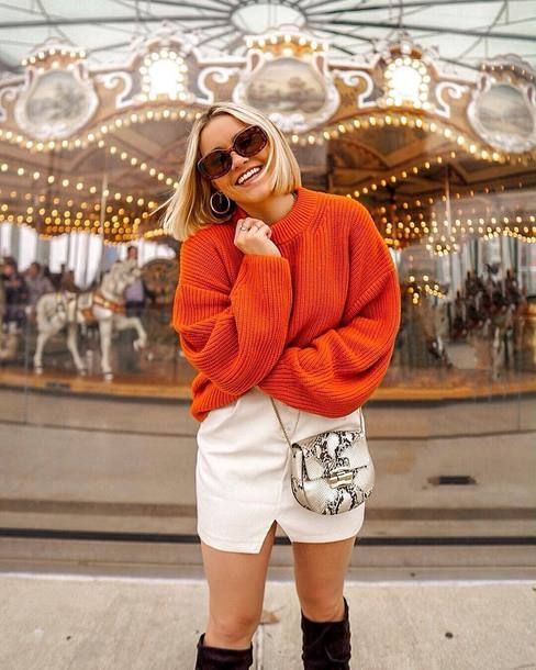 Asà que dependiendo del frÃo que haga en donde vives, podrás considerar alguno de estos outfits con suéter tejido naranja. En esta opción de abajo vemos por ejemplo un suéter, combinado con una falda de mezclilla de coloration blanco. Puedes usar botas, botines o tenis dependiendo de tu estilo.