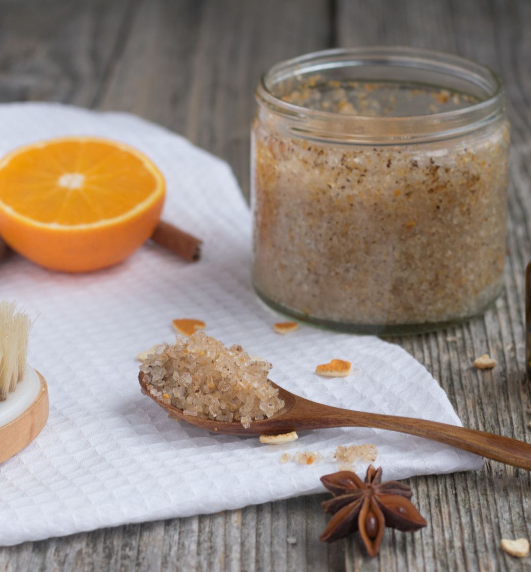 some form of exfoliant like sugar or salt and nourishing plant oils